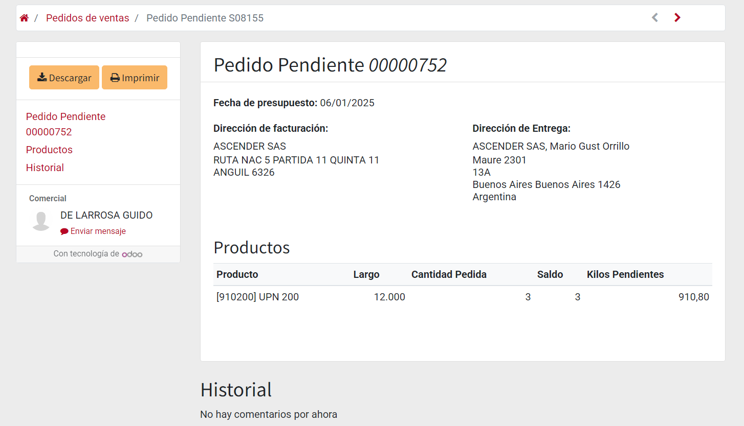 - Ver el Comercial: Observa quién es el responsable comercial del pedido y envíale un mensaje si es necesario.
