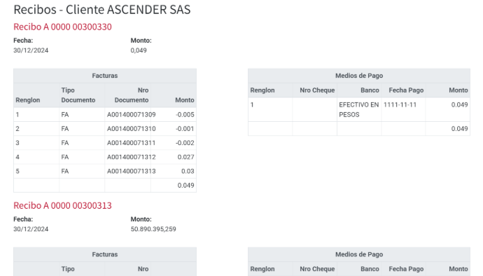 - Facturas asociadas: Tipo de documento, número de documento, monto, etc.